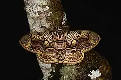 Brahmaea celebica was formerly treated as a subspecies of Brahmaea hearseyi.