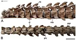 The 19 dorsal vertebrae are similar to the pectoral vertebrae, being weakly concave and taller than long, but the neural spines are proportionally taller than the centra. The single-headed dorsal ribs are rounded but slightly flattened in cross-section, and some have a prong-like projection at the top end; their articular surfaces are slightly concave. Underneath, there are at least ten pairs of gastralia, each of which tapers to the sides and has a central groove on the bottom surface. The three sacral vertebrae are similar, but have much smaller, blunter, more oval-shaped ribs. The comparatively smaller first sacral rib is directed further outwards and backwards than the other two ribs. There initially were 25 caudal vertebrae preserved, with 22 still being accounted for. The last several caudal vertebrae are partially fused into a pygostyle-like structure. The preserved caudal ribs are flattened, triangular, and taper towards the tip of the tail.[2]