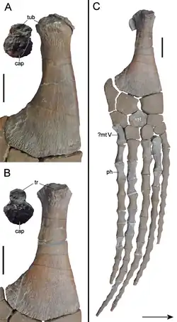 The humeri, which have a length of about 24 centimetres (9.4 in), are oval in cross-section, and about half as wide as they are long at the widest point. Their leading edges are curved in an S-shape, a trait also seen in Leptocleidus, Hastanectes, polycotylids, and the elasmosaurid Wapuskanectes, but not in Nichollssaura.[8][10] The only femur that is presently available is 21.5 centimetres (8.5 in) long; it is concave on one edge, whereas the other edge is straight near the top but curves sharply near the bottom. The rest of the long bones of the limb have been lost. Allegedly, the radius was similar to but smaller and straighter than the tibia, and there was a hole present between the tibia and fibula. The 14 preserved phalanges, which likely include elements from both the forelimbs and the hindlimbs, are long and hourglass-shaped.[2]
