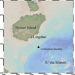 - ^ a b c d e f g Huang, Haochen; Chen, Jingxuan; Ke, Zhixin; Zhang, Chi (2025-02-11). "Branchiostegus sanae, a new species of deepwater tilefish (Eupercaria, Branchiostegidae) from the South China Sea". ZooKeys (1227): 129–142. Bibcode:2025ZooK.1227..129H. doi:10.3897/zookeys.1227.130512. ISSN 1313-2970. PMC 11836621. PMID 39981055.