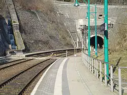 Brandleite Tunnel is a single-bore, double-tracked railway tunnel between the stations of Gehlberg (598 m a.s.l.) and Oberhof (639 m a.s.l.) in Thuringia. It leads the Neudietendorf–Ritschenhausen railway beneath the Brandleite massif, a part of the ridge of the Thuringian Forest that reaches a height of 897 m a.s.l. in this area.[1] The tunnel is mostly straight, only at the Oberhof end the tracks curve slightly towards the south. With a length of 3,039 m (9,970 ft) it is the longest railway tunnel in Thuringia, and was the longest in the network of Deutsche Reichsbahn in the GDR. The maximum rock cover amounts to 237 m (778 ft).