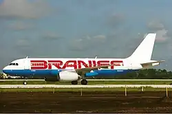A Braniff Airbus A320-200 taxiing at Orlando International Airport in 1989