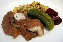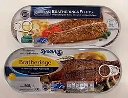 Brathering (/ˈbrɑːtˌheɪrɪŋ/ ⓘ; German: [ˈbʁaːtˌheːʁɪŋ] ⓘ; English: "fried herring") is a simple and traditional German dish of marinated fried herring. It is typical of the cuisine in northern Germany and the northern parts of the Netherlands, either for lunch or as a snack at fast food stands or take-out restaurants.[1]