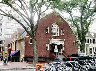 Brattle Hall is a historic building along Brattle Street near Harvard Square in Cambridge, Massachusetts. It was constructed in 1889 for the Cambridge Social Union – established in 1871 – when that organization moved into the adjacent William Brattle House that year. Brattle Hall was built to house the organization's library, and to provide a space for larger meetings and social functions. Brattle Hall was designed by Longfellow, Alden & Harlow, originally in the Dutch Colonial Revival style, but it acquired more of a Colonial Revival feel with the 1907 addition of brick ends, designed by Charles Cogswell.[2]
