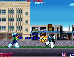 In Bravoman, the player controls the titular character, a bionic superhero who possesses telescopic limbs, in his mission to stop the evil scientist Dr. Bomb from taking over the world. Bravoman can punch, kick, and headbutt enemies to defeat them; the game uses pressure-sensitive buttons, where the harder the button is pressed, the stronger the player's attack is.[1] Bravoman can also jump over enemies and other obstacles in his way. He also has a health meter at the bottom-left of the screen, which will deplete when he is hit by an enemy or projectile. Most enemies leave behind small items known as "Fuku" when defeated.[1] Collecting ten Fuku will cause Bravoman's robotic friend Lottery Man to appear, who will give him a random powerup item. These include rice balls and noodles that will refill a portion of his health, a star that gives him the ability to fire atomic blasts from his fists, a drink that grants temporarily invincibility, and a bullet train that will warp him to the end of the level.[1]