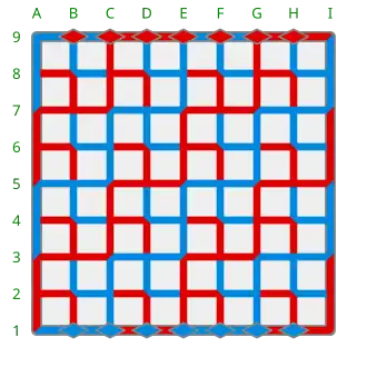Each player has seven pieces of the same two colors as the marked lines (e.g. blue and red). In the patent, it is suggested the pieces have one side plain and the other side marked to facilitate three or four-player games, where multiple players work together as a team.[1] The starting position for each player's seven pieces is in the rank closest to that player, as designated by the diamonds in Row 1 and Row 9, on the example board illustrated.