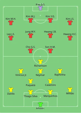 Vinícius Júnior opened the scoring for Brazil in the 7th minute, when he converted a side-footed shot to the right of the net past three Korean defenders on the line. Brazil were awarded a penalty six minutes later when Richarlison was fouled just inside the penalty area, which the returning Neymar scored with a low shot to the right corner of the goalkeeper, who didn't move. Richarlison made it 3–0 in the 29th minute when he controlled the ball with his head before receiving the ball back from Thiago Silva and passing into the left corner of the net. Lucas Paquetá got Brazil's fourth goal before half-time in the 36th minute, volleying low into the left corner of the net with his right foot after a cross from Vinícius Júnior on the left. In the second half, South Korea pulled a goal back when Paik Seung-ho finished into the right of the net from thirty yards out. With ten minutes left and leading by three goals, Brazilian goalkeeper Alisson was substituted for third-choice keeper Weverton, making Brazil the first team to ever play 26 different players in single World Cup.[12][13]