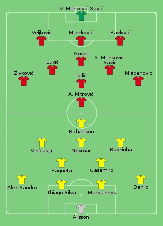 After a goalless first half, Richarlison opened the scoring for Brazil in the 62nd minute, when he followed up to finish after Serbian goalkeeper Vanja Milinković-Savić saved Vinícius Júnior's low shot from the left, with Neymar initially creating the chance.[2] Richarlison then made it 2–0 eleven minutes later when he controlled the ball from Vinícius Júnior before finishing to the left of the net with an over-the-shoulder acrobatic right-footed kick. Casemiro hit the woodwork and Fred also had a shot saved with Brazil running out comfortable 2–0 winners.[3]