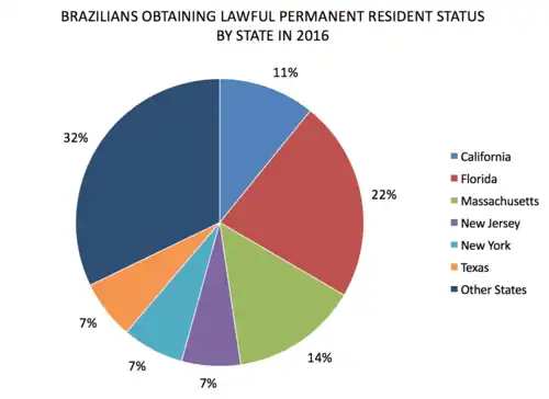 The top three classes of admissions for Brazilians obtaining lawful permanent status in the U.S. in 2016 was family-sponsored, employment, and immediate relatives of U.S. citizens. Each category of admissions makes up of 4%, 25%, and 68% respectively of the total individuals.[18]