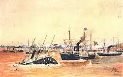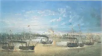 The steamer Villa del Salto escaped and was only sighted on August 24 by two corvettes and a gunboat, while carrying troops to fight the Colorados. These vessels fired on the Uruguayan steamer to stop it, but it ignored the shots and a demand to surrender.[28] It was only on September 7, while trying to flee to Argentina, that Villa del Salto was neutralized. It ran aground in Paysandú and was set on fire by its crew to avoid being captured by the Brazilians.[29] From then on, the imperial fleet acted together with Brazilian land forces, in addition to blocking the cities of Salto and Paysandú.[30][31]