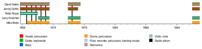 The band was fronted by David Gates (vocals, bass guitar, guitar, keyboards, violin, viola, percussion) with Jimmy Griffin (vocals, guitar, keyboards, percussion) and Robb Royer (bass guitar, guitar, flute, keyboards, percussion, recorder, backing vocals). On their first album session musicians Ron Edgar played drums and Jim Gordon played drums, percussion, and piano. Mike Botts became their permanent drummer when he joined in the summer of 1969, and Larry Knechtel replaced Royer in 1971, playing keyboards, bass guitar, guitar, and harmonica.[3][4][5]