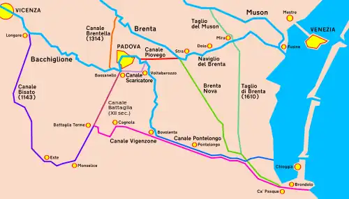 It is 174 kilometres (108 mi) long[1] and was first channelled in the 16th century when a long canal was built from the village of Stra to the Adriatic Sea, bypassing the Venetian lagoon. A branch of the Brenta, named Naviglio del Brenta, was left to connect directly Venice and Padua (which was a kind of second capital of the Venice Republic). It runs through Stra, Fiesso d'Artico, Dolo, Mira, Oriago and Malcontenta to Fusina (which is part of the comune of Venice).