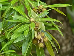 Breonadia salicina is a medium to large evergreen tree. The leaves occur alternately or in whorls of 3 to 5. The leaf shape is generally lanceolate and the leaf margin is entire. They are leathery to the touch and usually a dark green with yellow on the midrib, which is slightly raised.[6] The fruit is a capsule and they cluster in small spheres.[6] The trees are monoecious[7] with flowers that are small and yellow in colour. The tree is generally found in subtropical to tropical climates, mainly in small populations in South Africa to Saudi Arabia and even Madagascar. It can be found in areas up to 2,000 meters above sea level. They usually live on river banks or in the waters of a stream.[7]