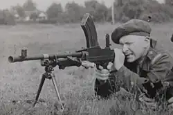 Shaw (left), 5th Battalion Sherwood Foresters at Bisley 1947, firing a Bren light machine gun. The 5th Battalion team won the 'China Cup', 'Velongdis Cup' and 'Lewis 9mm' cup at Bisley in 1947