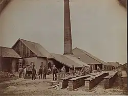 Men working in the yard of a brickworks in Germany, the tall chimney of the kiln visible, 1890