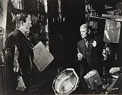 Colin Clive and Boris Karloff reprised their roles from Frankenstein as creator and creation, respectively. Hobson recalled Clive's alcoholism had worsened since filming the original, but Whale did not recast the role because his "hysterical quality" was necessary for the film.[15] Karloff strongly objected to the decision to allow the Monster to speak: "Speech! Stupid! My argument was that if the monster had any impact or charm, it was because he was inarticulate – this great, lumbering, inarticulate creature. The moment he spoke you might as well ... play it straight".[18] This decision also meant that Karloff could not remove his dental plate, so now his cheeks did not have the sunken look of the original film.[8] Whale and the studio psychiatrist selected 44 simple words for the Monster's vocabulary by looking at test papers of ten-year-olds working at the studio.[5] Dwight Frye returned to play the doctor's assistant, Karl, having played the hunchback Fritz in the original. Frye also filmed a scene as an unnamed villager and the role of "Nephew Glutz", a man who murdered his uncle and blamed the death on the Monster.[8] Boris Karloff is credited simply as KARLOFF, which was Universal's custom during the height of his career.[19] Elsa Lanchester is credited for Mary Wollstonecraft Shelley, but in a nod to the earlier film, the Monster's bride is credited only as "?" just as Boris Karloff had been in the opening credits of Frankenstein.
