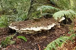 The fungus has been found in the Cascade Range in Washington and Oregon, the Coast Range on the Olympic Peninsula in Washington, and in Redwood National Park in northern California.[11] Specimens have been found at elevations of 1,000–4,000 feet (300–1,220 m).[10] Because the fungus feeds on both dead and living wood,[12] it is both parasitic and saprophytic.[6] B. nobilissimus fruit bodies do not occur on fallen logs or other forms of dead wood lacking roots or some connection to a root system. Conks have been found growing on the still-living roots of an upturned, windthrown tree, while a once-living conk died within several years after the host tree was uprooted by a fallen tree.[13]
