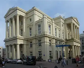 A small parish at the end of the 18th century, Hove began to expand in the early 19th century alongside the westward development of Brighton, and in 1832 became incorporated into the parliamentary constituency of Brighton.[8] In 1873 commissioners from Hove, West Hove and Brunswick were amalgamated as means to guard against the dominance of Brighton.[9] The first public buildings were completed in the late 19th century, including the original town hall in 1882. The parish of Aldrington was annexed by Hove in 1893.[8] A municipal borough of Hove was formed by royal charter in 1889, granting Hove administrative autonomy. Further expansion took place in 1927, with the addition of the parishes of Preston Rural and Hangleton and westerly sections of West Blatchington and Patcham.[8] Hove gained its own parliamentary constituency in 1950. The Local Government Act 1972 abolished the remaining parishes of Hove, Aldrington and Hangleton and West Blatchington to form the unparished non-metropolitan district of Hove.[10] It also incorporated the nearby town of Portslade-by-Sea into the new district. The new boundaries established by the Act remained largely the same until unification with Brighton a quarter of a century later.