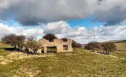 The Downland to the north of Patcham leads up to Ditchling Beacon and the western end of the Clayton to Offham Escarpment. Tegdown Hill is the next hill to the west of the downland Ditchling Road. A remarkable "ring barrow" survives (TQ 313 101) on its brow, together with the slight mounds of two other bowl barrows. Tegdown ring barrow has been described as "probably the best of this type in the county".[30] It consists of a circular bank with a ditch and a flattish interior. It lies just south of a big dried up dew pond. From Tegdown you can see the three Iron Age camps of Hollingbury Castle, Ditchling Beacon, and the Devil's Dyke. To the north of the city boundary is the long Ditchling parish.