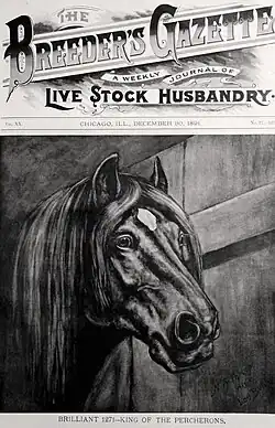 Brilliant 755's popularity is attested to by various authors. In 1910, French veterinary surgeon Alfred Gallier named him one of the most outstanding Percheron stallions. American journalists and breeders Alvin Howard Sanders and Wayne Dinsmore cited him in 1917 as the greatest Percheron improvement stallion in the United States, and the best Percheron stallion ever to have existed[5]: 239-240 . Based on the first volume of the Percheron Stud-Book published in 1883[1]: 43 and the archives of the Illinois Agricultural Society,[6] Brillant was born in 1876 in Eure-et-Loir, to breeder Ernest Perriot.[a] He was initially owned by his breeder, residing at La Chenelière, in Nogent-le-Rotrou.[3]: 39 Ernest Perriot bred many other famous Percherons, with Sanders and Dinsmore also crediting him with the birth of Brillant 755's own sire, named Brillant 756.[5]: 215 Ernest Perriot bred all five sires of famous Percheron bloodlines, making him the breeder who has exerted a greater influence on the Percheron breed since 1880 than any other breeder in France or America.[5]: 243