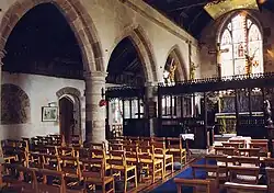 St Mary's church at Wormsley (grid reference SO4275247793) is Grade II* redundant parish church put under the care of the Churches Conservation Trust in 1974. The church dates to the 12th century, altered later, and with a 19th-century chancel rebuild. Of sandstone with a Welsh slate roof, it comprises a 15½ ft by 13½ ft (4.7m by 4.1m) two-bay chancel, a 37 ft by 15 ft (11.3m by 4.6m) three-bay nave, with a double bellcote, and south porch. Elements of the nave, particularly the south doorway and font, are 12th century, the rest, especially the chancel, dates to the 13th. On the interior north wall are memorials to two men who died in the First World War, one to Lt Thomas Andrew Greville Rouse-Boughton-Knight of Wormsley Grange, the other to Rifleman Edward Charlton a former gamekeeper on the Wormsley Estate. In the churchyard are early 19th-century table tombs to archaeologist Richard Payne Knight, and his brother, horticulturist Thomas Andrew Knight. Other tombs to the Knight family are to sisters Ursula (died 1777) and Barbara (died 1780). There is also a base to a churchyard medieval cross, probably 14th century.[43][44][45][46][47][48][49]
