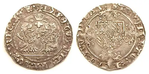 Double briquet, struck in 1478 under Mary of Burgundy. Obverse: Two lions rampant combatant, fire-steel (briquet) above. Reverse: Shield of Burgundy over floriated cross