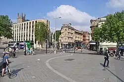 The rebuilding of Bristol city centre was characterised by 1960s and 1970s skyscrapers, mid-century modern architecture and road building. Beginning in the 1980s some main roads were closed, the Georgian-era Queen Square and Portland Square were restored, the Broadmead shopping area regenerated, and one of the city centre's tallest mid-century towers was demolished.[86] Bristol's road infrastructure changed dramatically during the 1960s and 1970s with the development of the M4 and M5 motorways, which meet at the Almondsbury Interchange just north of the city and link Bristol with London (M4 eastbound), Swansea (M4 westbound across the Severn Estuary), Exeter (M5 southbound) and Birmingham (M5 northbound).[87] Bristol was bombed twice by the IRA, in 1974 and again in 1978.[88]