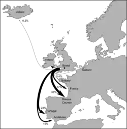 It has been suggested that the decline of Bristol's Iceland trade for 'stockfish' (freeze dried cod) was a hard blow to the local economy, encouraging Bristol merchants to turn west, launching unsuccessful voyages of exploration in the Atlantic by 1480 in search of the phantom island of Hy-Brazil.[40] More recent research, however, has shown that the Iceland trade was never more than a minor part of Bristol's overseas trade and that the English fisheries off Iceland actually increased during the late 15th and 16th centuries.[41] In 1487, when king Henry VII visited the city, the inhabitants complained about their economic decline. Such complaints, however, were not uncommon among corporations that wished to avoid paying taxes, or which hoped to secure concessions from the Crown. In reality, Bristol's customs accounts show that the port's trade was growing strongly during the last two decades of the fifteenth century.[42][43] In great part this was due to the increase of trade with Spain.[44][45]
