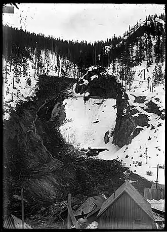 On March 22, 1915, a rock avalanche of 100,000 m3 destroyed the Jane Camp.[1] The exact time the landslide hit is unknown but about 12:45 a.m. workers down the mountain knew something was wrong when hoppers that workers were supposed to be filled with ore at Jane Camp were arriving empty at the bottom of the mountain.[3]