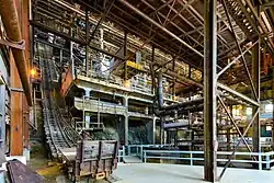 The mill received ore at its peak, 230 feet (70 m) from its base, where it entered the concentrator.[8] It passed down stages of the concentrator by gravity,[9] through eight levels of the structure.[8] From the bottom level, it was piped directly into the hold of a cargo ship.[9]