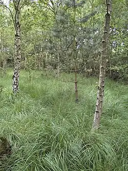 The habitat is typically a rather open woodland canopy, mainly of birch but often with some alder, willow and oak, with a typically sparse shrub layer that may contain some hawthorn and alder buckthorn. The field and ground layers are sometimes formed of either a lawn of Sphagnum or a taller sward of purple moor-grass or, on less moist soils, a dense cover of bracken.[2] In the less common W4b subcommunity, various rushes and sedges are abundant. There are no tall trees in a W4 wood, as downy birch grows only to about 20 m and it is not long-lived, so there is usually an abundance of dead and decaying trees, giving the habitat a "moribund" look.[3][1]