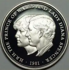 Reverse: A profile portrait of Lady Diana Spencer partially covered by a profile portrait of The Prince of Wales, both facing to the left, with the inscription H.R.H. THE PRINCE OF WALES AND LADY DIANA SPENCER 1981. This face was designed by Philip Nathan.