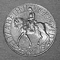Obverse: A portrait of Queen Elizabeth II riding a horse, in a similar style to the 1953 crown celebrating her coronation. The inscription reads ELIZABETH·II DG·REG FD 1977.