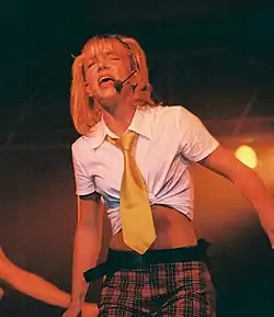 In June 1999, Spears began her first headlining ...Baby One More Time Tour in North America, which was positively received by critics.[34] It also generated some controversy due to her racy outfits.[35] An extension of the tour, titled (You Drive Me) Crazy Tour, followed in March 2000. Spears premiered songs from her upcoming second album during the show.[19]