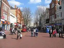 Broad Street is a main pedestrianised thoroughfare and the primary high street in the English town of Reading.[1] The street is situated in the town centre, running for approximately 0.25 miles (0.40 km), from west to east. The western end of the road lies at the crossroads with Oxford Road, West Street and St Mary's Butts. The eastern end continues as King Street after the junction with Minster Street and Butter Market (Market Place).