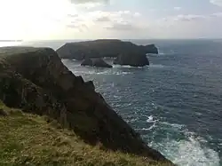 The Stags of Broadhaven (Irish: Na Stácaí) are a group of five jagged rocky islands off the high cliffs of Benwee Head of Kilcommon parish. Although only just over a mile from the mainland, they lie outside County Mayo. The islands include the central island Teach Dónal Ó’Cléirigh, the highest. To the south lies An Teach Mór. To the east is An Teach Beag. The fourth island is The Stags NW of centre, Carraig na Faola, NW of centre and An t-Oighean (78m).[5] They rise out of the sea rising steeply to over 100 metres above sea level. The islands support puffin, Storm & Leach’s petrels. One of the rocks is entirely bisected by a long narrow cave dramatically from one side to the other and they are a popular site for visiting divers, sub aqua teams, canoeists and adventurers. The Stags were formerly grazed for about six weeks every summer until the 1960s.[6]