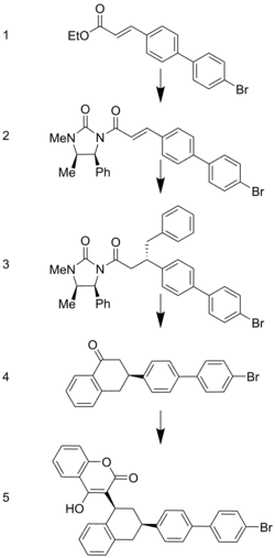 Brodifacoum is a derivative of the 4-hydroxy-coumarin group. Compounds numbers are found next to their respective compounds in the image below. Compound 1 is the starting ester needed to synthesize brodifacoum. To obtain this starting Compound 1, a simple Wittig condensation of ethyl chloroacetate with 4’-bromobiphenylcarboxaldehyde is accomplished. Compound 1 is transformed into Compound 2 by consecutive hydrolysis, halogenation to form an acid chloride, and then reacted with the required lithium anion. This is done using KOH and EtOH for hydrolysis, and then adding SOCl2 for chlorination to form the acid chloride which reacts with the addition of lithium anion. Compound 2 is then transformed using organocopper chemistry to yield Compound 3 with good stereoselectivity of about 98%. Typically, a Friedel-Crafts type cyclization would then be used to obtain the two-ring system portion of Compound 4, but this results in low yield. Instead, trifluoromethanesulfonic acid in dry benzene catalyzes the cyclization with good yield. The ketone is then reduced with sodium borohydride yielding a benzyl alcohol. Condensation with 4-hydroxycoumarin under HCl yields Compound 5, brodifacoum.[4]
