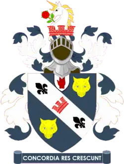 | Crest | Out of a mural crown Gules a unicorn’s head Argent horned Or in the mouth a rose Gules slipped and leaved Proper. |