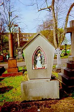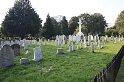 In the late 1880s when the nearby Earl's Court Exhibition Grounds played host to the American Show with Buffalo Bill, a number of Native American performers in the show, died while on tour in Britain.[21] The Sioux chief, Long Wolf, a veteran of the Oglala Sioux wars was buried here on 13 June 1892 having died age 59 of bronchial pneumonia. He shared the grave with a 17-month-old Sioux girl named White Star believed to have fallen from her mother's arms while on horseback. A British woman, Elizabeth Knight, traced his family 105 years later and campaigned with them to have his remains returned to the land of his birth.[22] In 1997, Chief Long Wolf was finally moved to a new plot at Wolf Creek Cemetery (ancestral burial ground of the Oglala Sioux tribe) in Pine Ridge, South Dakota.