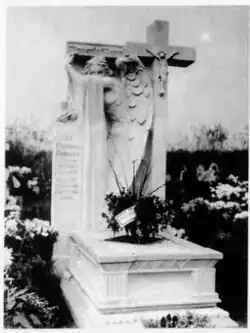 • A "Jubilee Cross" for the Church of the Holy Trinity in Bydgoszcz (1934). It is currently located on the northern wall of the nave of the church. The monumental cross is approx. 430 centimetres (14.1 ft) high, with life-size figures, made of polychrome wood. The work was founded by the "Brotherhood of the Living Rosary of Mothers" (Polish: Bractwo Żywego Różańca Matek) and consecrated on 18 November 1934.