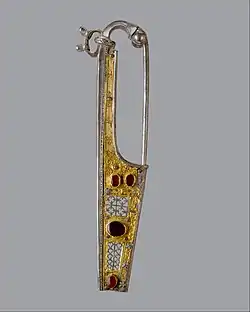 A brooch (/ˈbroʊtʃ/, also US: /ˈbruːtʃ/[1]) is a decorative jewellery item designed to be attached to garments, often to fasten them together. It is usually made of metal, often silver or gold or some other material. Brooches are frequently decorated with enamel or with gemstones and may be solely for ornament or serve a practical function as a clothes fastener. The earliest known brooches are from the Bronze Age. As fashions in brooches changed rather quickly, they are important chronological indicators. In archaeology, ancient European brooches are usually referred to by the Latin term fibula. One example is the Tara Brooch.