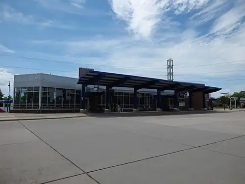 Brooklyn Center Transit Center (BCTC) is a transit center in the Minneapolis suburb of Brooklyn Center, Minnesota. Owned and operated by Metro Transit, it is one of the busiest single boarding locations in the Twin Cities. The transit center is not a park and ride, but provides free 10-minute parking and free outdoor bike racks.[2] June 8, 2019 Metro Transit's second bus rapid transit line, the Metro C Line, opened with Brooklyn Center Transit Center as the line's northern terminus.[3][4] The Metro D Line opened in December 2022, also using the center as its northern terminus. The transit center opened December 4, 2004 and cost $1.9 million.[5] Before opening of the C Line, charging stations were installed for end-of-the-line charging of 8 battery electric buses used on the C Line and D Line.[6]