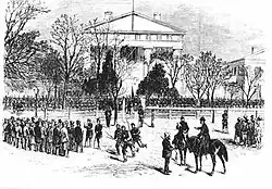 An artist's interpretation of Brooks and Baxter troops on the State House lawn, based on a photograph dating to the American Civil War. By the time of the Brooks-Baxter War, the split rail fence had been replaced by the wrought iron that is there now.