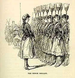 Broom brigades were organized women's groups that performed military-style drills using brooms instead of rifles during the late 19th century. These brigades became particularly popular in the 1880s across the United States, especially during patriotic events such as the Fourth of July. The term broom brigade was famously referenced by Mark Twain in his book Life on the Mississippi (1883), where he described watching a group of women in New Orleans perform their drills with "grace, spirit, and admirable precision," humorously noting that they did everything with a broom except sweep. Broom brigades reflected a blend of cultural ideas. On one hand, they aligned with the "cult of domesticity" prevalent at the time, which emphasized women's roles as caretakers and homemakers. On the other hand, their participation in public demonstrations of martial skill—such as military drills and marches—signaled shifting gender norms and the expanding roles of women in public life, including activities traditionally associated with men..[1][2][3]