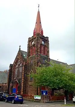 The church was founded as the Broomhill United Free Church and became Broomhill Parish Church in 1929, after becoming part of the Church of Scotland.[1] It was built using red sandstone church between 1902 and 1905. The church hall was built in 1899. The plans were designed by Stewart & Paterson in the Neo-Gothic cruciform style. A tower was built with a spire in the south west corner.