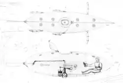 The submarine was 10 feet, 6 inches long by 27 inches high by 25 inches wide and displaced about six tons when submerged.[1] She was equipped with eight dead-lights on top to provide interior light, and a top hatch with a retractable conning tower for surface navigation. For propulsion, she had three sets of duck-foot paddles and a large rudder. She was also equipped with hatches with leather seals in order to make possible some manipulations outside the hull, a small ballast system with a lever and piston, and a 50 lb anchor. The ship had a complement of three men.