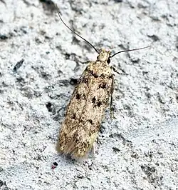 The wingspan is 12–13 mm.[2][3] The head is pale whitish- ochreous, sprinkled with fuscous. Terminal joint of palpi longer than second. Forewings whitish-ochreous, irrorated with fuscous; small black spots on base of costa and dorsum, and one in disc near base; stigmata black first discal above plical; a somewhat angulated pale fascia at 3/4, preceded by a blackish costal spot. Hindwings pale grey. Larva reddish- brown, paler on each side of dorsal line, sides marbled with paler; spots black, conspicuous; head and plate of 2 blackish.[4][5][6][7]