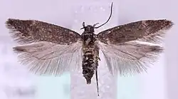 The wingspan is 11–13 mm.[2] The terminal joint of palpi longer than second. Forewings dark fuscous, somewhat paler sprinkled; stigmata indistinctly blackish, first discal beyond plical; a faint slender obtusely angulated pale fascia at 3, forming an indistinct ochreous-whitish spot on costa. Hindwings grey, paler anteriorly.[3][4][5][6]