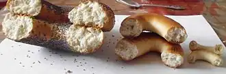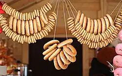 Bubliks are made from yeast-leavened wheat dough that commonly contains milk, butter, and egg whites and is rather sweet. Poppy seeds are a popular addition to the dough, as well as several other fillings. For savory bubliks, sugar is omitted and instead grated cheese and a few drops of onion juice can be added.[1] Bubliks are featured by professional bakers in their shops and at country fairs and regional markets. They are usually strung on a string by the dozen.[1]