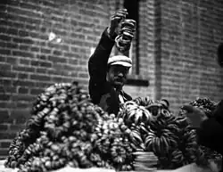 William Pokhlyobkin traces the origin of Russian baranka to what is now Belarus, in particular to the town of Smarhon’ (the former Grand Duchy of Lithuania).[11] Until they were murdered in the Holocaust, most of the population of Smarhon' was Jewish. Baranki were supposedly used to feed bears in the local school of bear training (the so-called "Bear Academy"). Written accounts of Smarhon' baranki appeared in the 19th century. Adam Kirkor wrote in the encyclopedia Picturesque Russia: "In Smorgon', Oshmyany district, Vilna province, almost all the petty bourgeois population is busy baking small bubliki, or kringles, which are widely known as Smorgon' obvaranki. Each traveller would definitely buy several bundles of these bubliki; besides, they are transported to Vilna and other cities."[12] Władysław Syrokomla mentioned Smarhon' as "the capital of obwarzanki famous in all Lithuania".[13] Smarhon' obwarzanki were a traditional treat at Saint Casimir's Fair in Vilnius.[14][15]